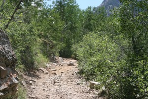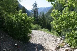 At the base of the now-defunct Marble Ski Area, the trail emerges onto National Forest lands and crosses Carbonate Creek. Just on the other side of the creek, the trail climbs up a very steep incline. BE ADVISED that the trail is in imminent danger of falling into the creek in two locations. It’s situated on an unconsolidated slope with overhangs above the creek 40 feet below. It would be wise, especially for horseback riders, to bushwhack across the mountain to gain elevation until you rejoin the trail.